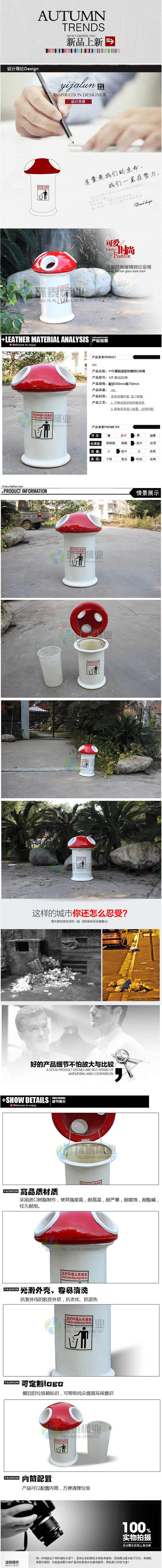 玻璃钢垃圾桶HT-BLG2130,该产品整体采用优质的玻璃钢材质生产加工而成,产品颜色为:白/红色,规格为直径500mm高750mm,本款户外蘑菇造型玻璃钢垃圾桶采用手糊成型法制作成型;采用优质玻璃纤维与进口树脂着色合成,它强度高,耐腐蚀,耐酸碱,抗老化,太阳暴晒下不变形,抗紫外线,环泰桶业玻璃钢垃圾桶易清洗,操作方便,果皮箱收集容量大,坚固耐用使用寿命长,果皮桶无盗用和回收价值.洁净、美观、醒目、不退色.采用模具一次成型.密封性好,不污染环境.有的是镀锌板内胆”,HT-BLG2130玻璃钢垃圾桶也可按照您的具体需求仅定制颜色,详见说明或咨询客服.环泰愿为环保护航,一切为您,放心采购。