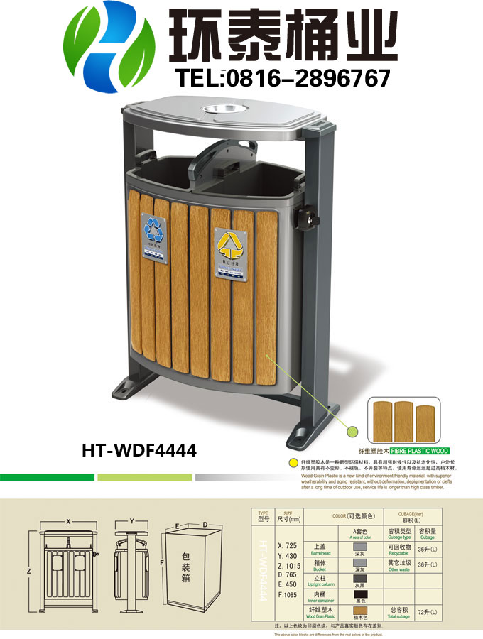 鋼木垃圾桶HT-WDF4444,該產品整體采用優質的電解溶鍍鋅板,防腐木生產加工而成,產品顏色為:深灰色+木條原色,規格為725*430*1015mm,本款德瀾仕電解分類鋼木垃圾桶采用優質的電解溶鍍鋅板,整體拉伸工藝目前在鋼板成型類產品的制造方面較為先進的工藝為一次性拉伸成型工藝造型美觀,無焊接一次成型,從而避免了焊接點銹蝕,同時也具有較高的堅固性,所以此工藝鋼板材料類的首選工藝,表面處理:在金屬表面處理方面選擇靜電噴涂工藝,此工藝相比傳統的烤漆工藝,其特點表現為較高的戶外適應性,表面涂層較為堅固,不易脫落,抗紫外線以及耐候性強.上蓋底沿口采用了內翻邊成型工藝,搖擺中軸式旋轉機構加配旋轉把手,清理更加方便,清理完畢后箱體自動回位.木條采用纖維塑膠木具有超強耐候性及抗老化性,戶外長期使用具有不變形、不褪色、不開裂等特點,使用壽命遠遠超過高檔木材。,HT-WDF4444鋼木垃圾桶也可按照您的具體需求可定制尺寸和顏色,可印制LOGO及文字,詳見說明或咨詢客服.環泰愿為環保護航,一切為您,放心采購。